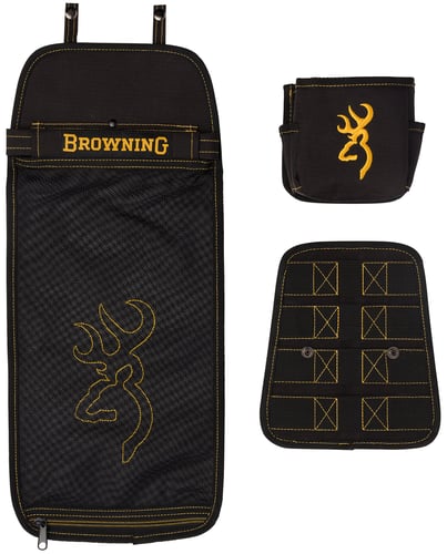 The Browning Shell Pouch is made with water-resistant black ripstop fabric with contrasting gold stitching. Large fired hull pouch and shell box holder attach to the semirigid MOLLE platform or each item may be used individually.